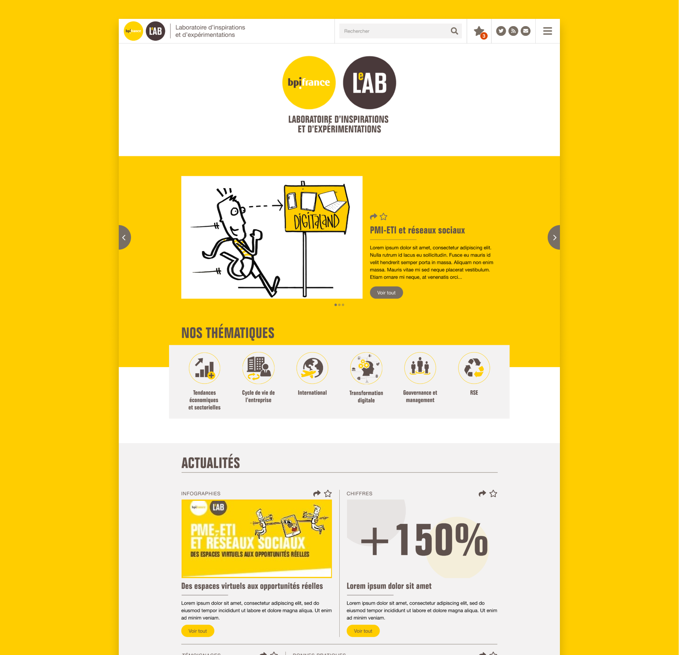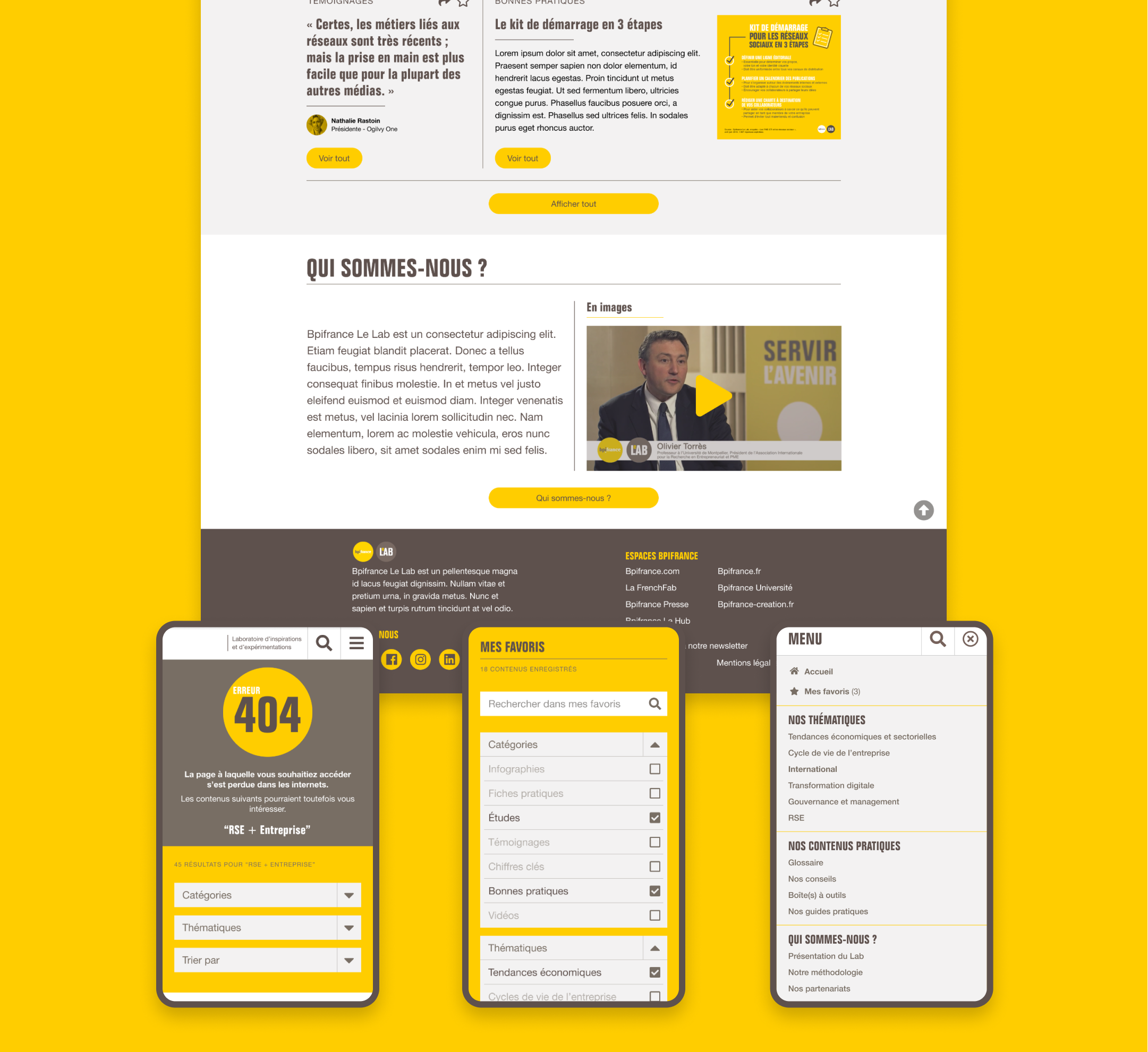 À partir de wireframes réalisées par L:EDigitalab et de la charte graphique fournie par les équipes de Bpifrance, j’ai réalisé les déclinaisons web desktop et mobile du nouveau site Bpifrance Le Lab.
