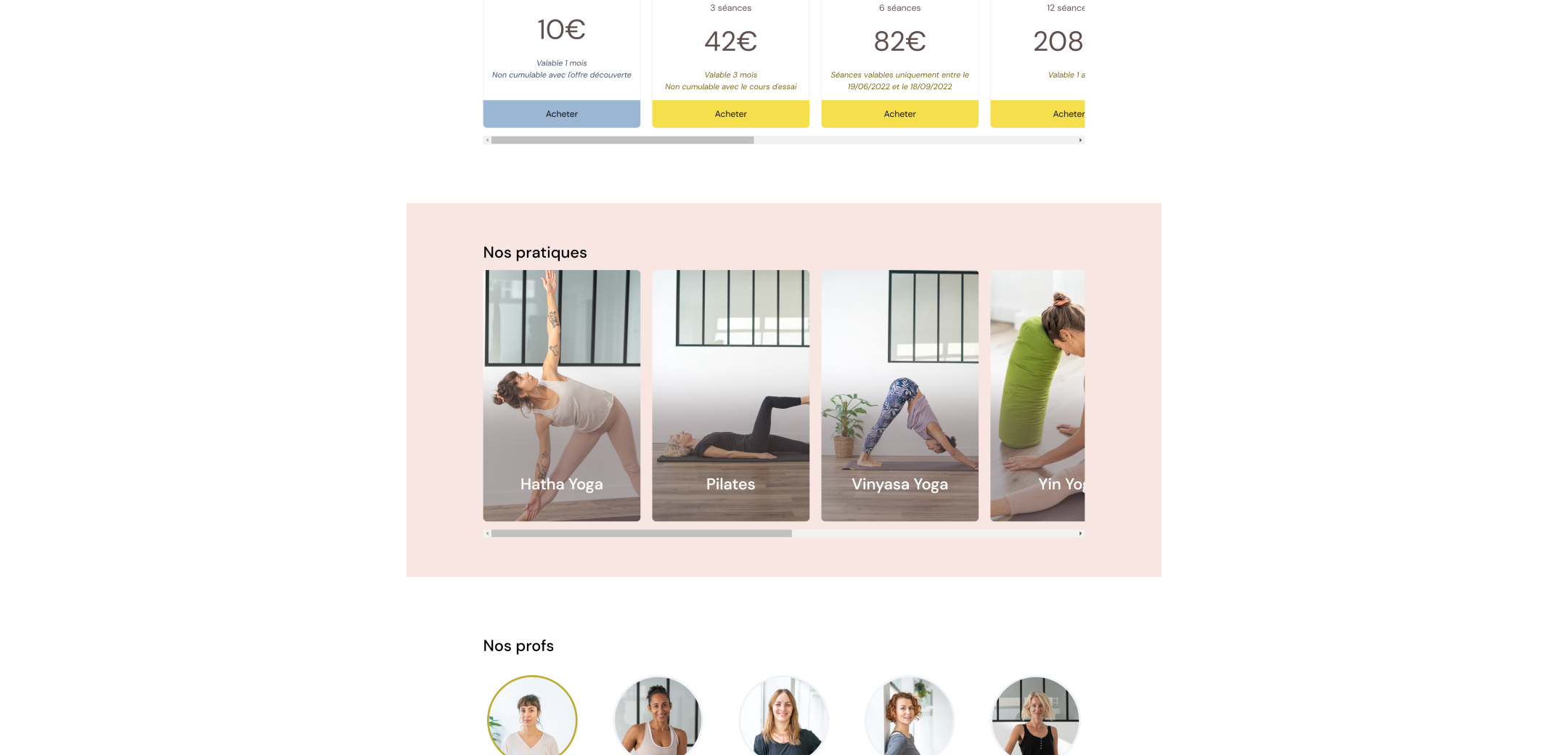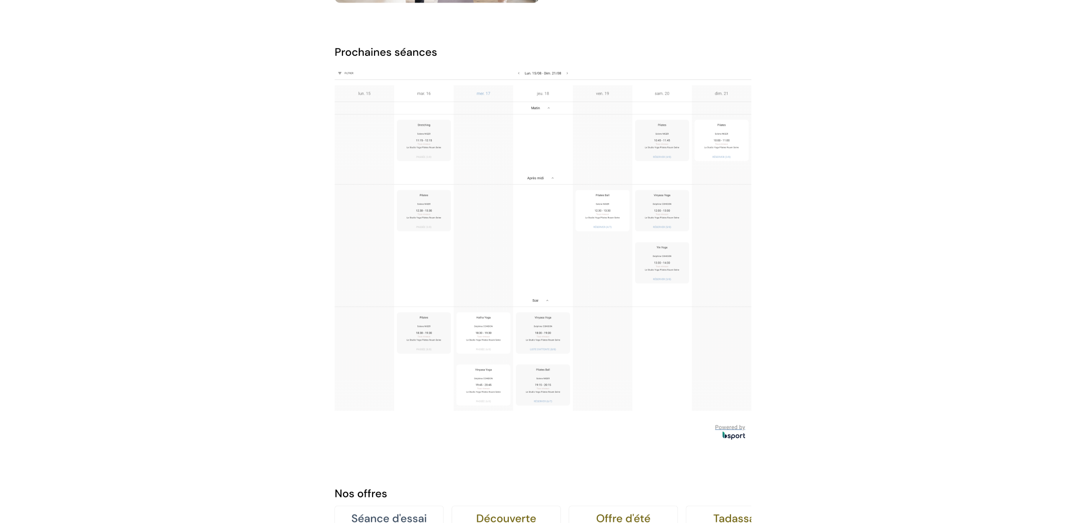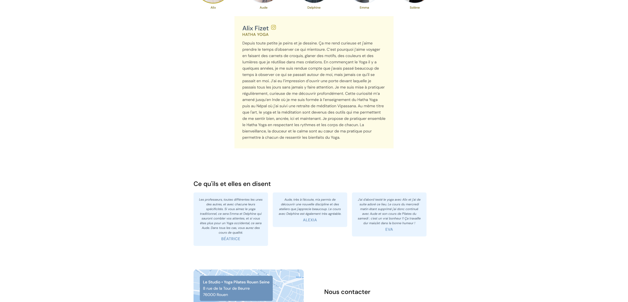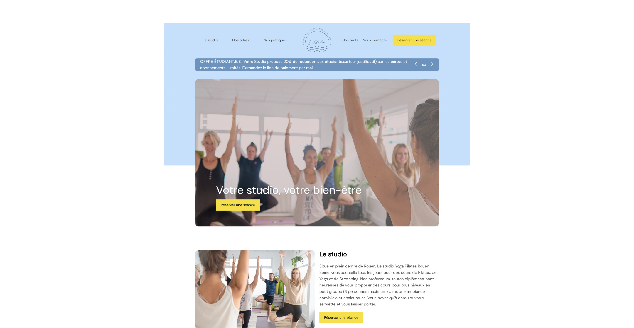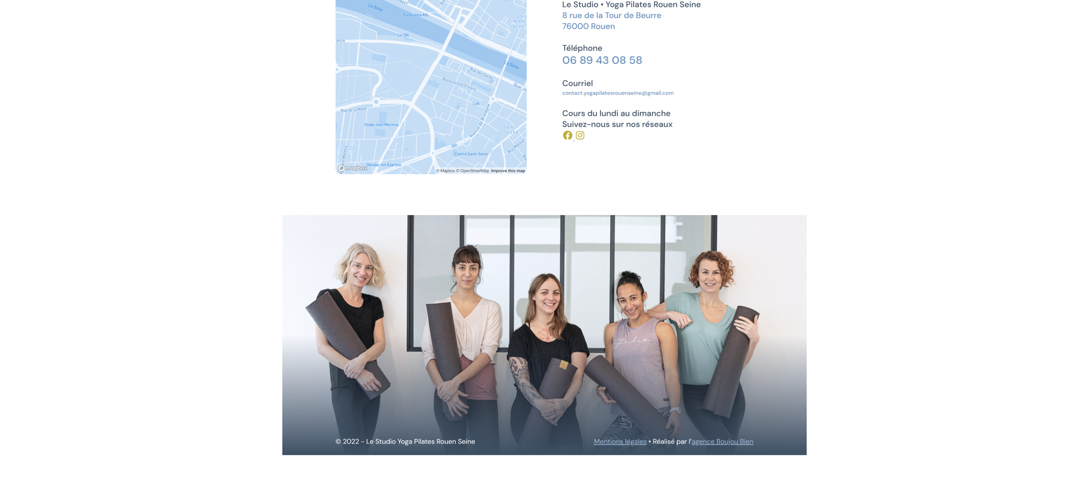 Une fois la charte graphique définie, j'ai réalisé un site one-page présentant le Studio. Cette page se veut simple, immersive et permettant d'avoir en un coup d'œil toutes les infos nécessaires pour commencer sa première séance. Le tout est accompagné des photos de l'agence Boujou Bien (avec un guest en tant que modèle 😉).