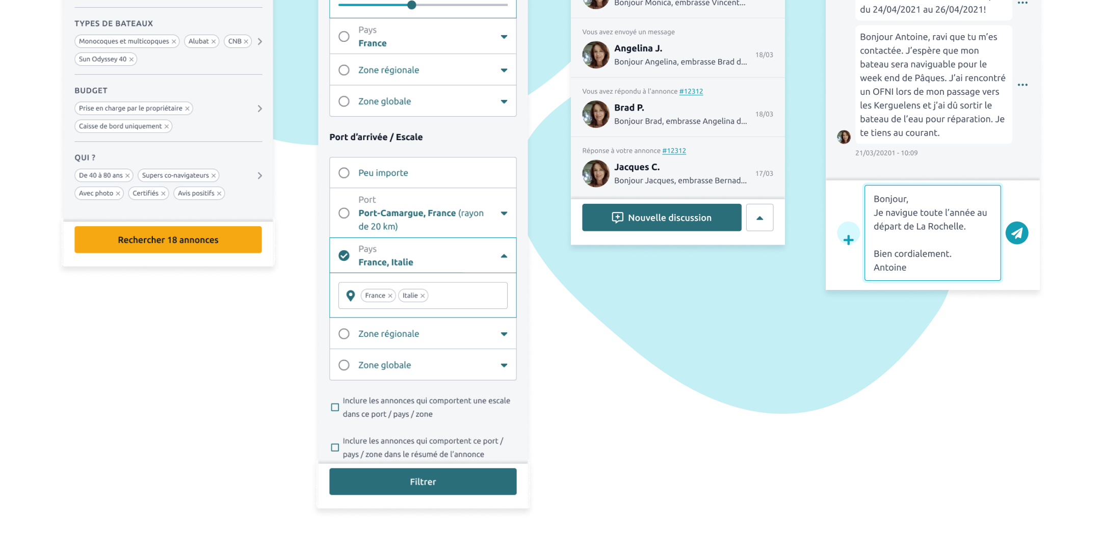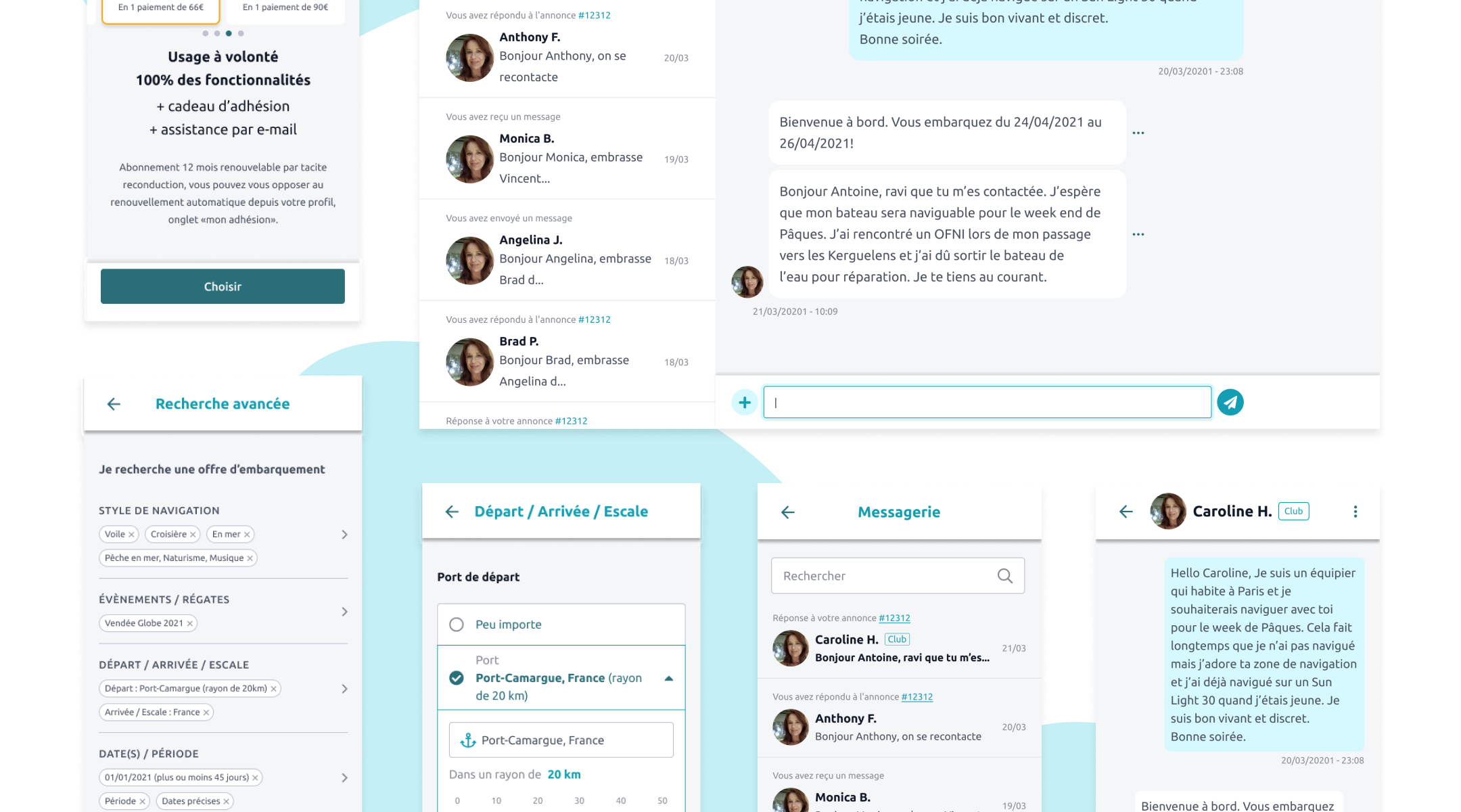 Le design se veut clair et moderne, avec un langage visuel basé autant sur les codes des interfaces actuelles que sur le monde de la voile. La place donnée aux infos de navigation est primordiale, afin de trouver au plus vite sa navigation ou son équipier pour la prochaine sortie en mer.